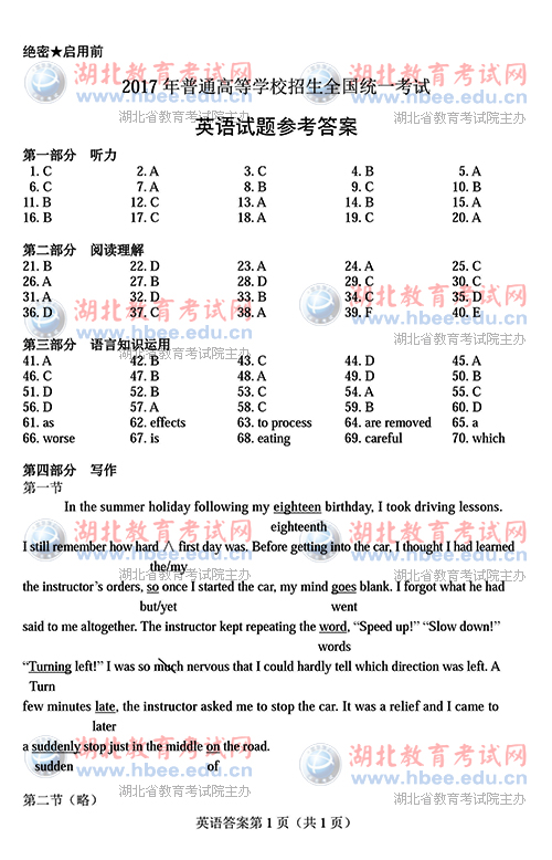 2017年湖北省高考英语试卷及参考答案